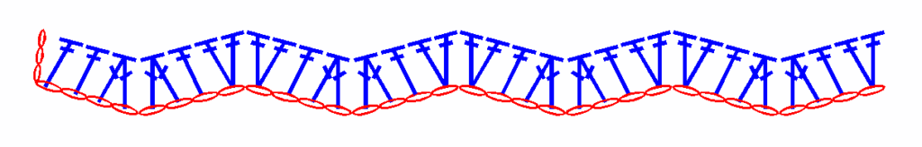 Row 1: 1 DC in fourth ch from hook, 1 DC in next ch, [2DCTOG] twice, 1 DC in next ch, 2 DC in next ch, *2DC in next ch, 1DC in next ch, [2DCTOG] twice, 1 DC in next ch, 2 DC in next ch; repeat from * to end and turn.