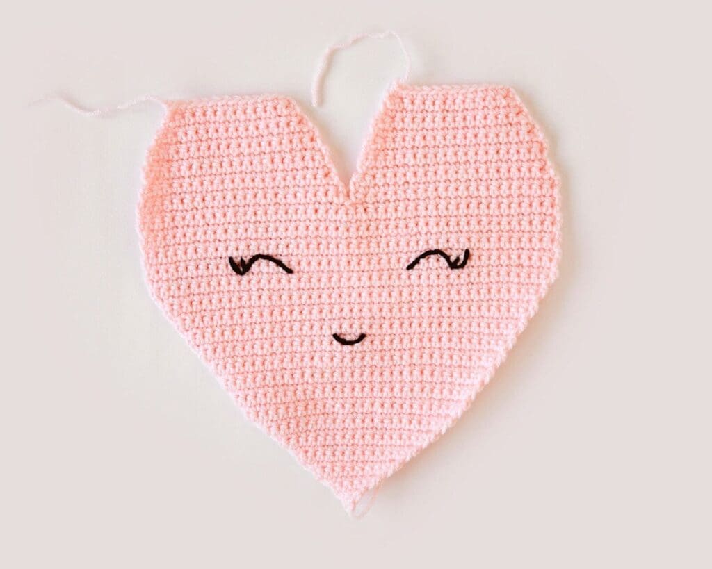 Fasten off. You can embroider on some eyes and mouth like the pillow in the photo, or you can just leave your heart as it is.