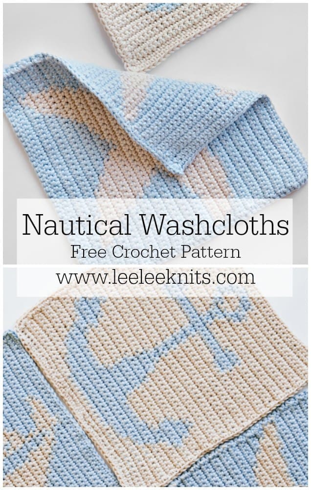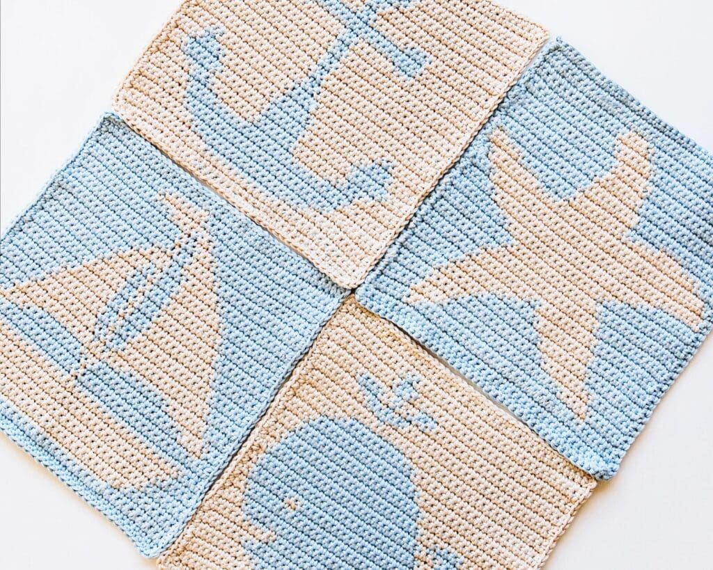 Lately I’ve been obsessed with tapestry crochet (crocheting with more than one color in a row) because I love to draw and turn my designs into washcloths and pillow covers. My latest project is this set of washcloths that I made for my son’s bath time. He’s been asking me to make him some new washcloths and I know how much he loves the beach, so I went with a nautical theme.