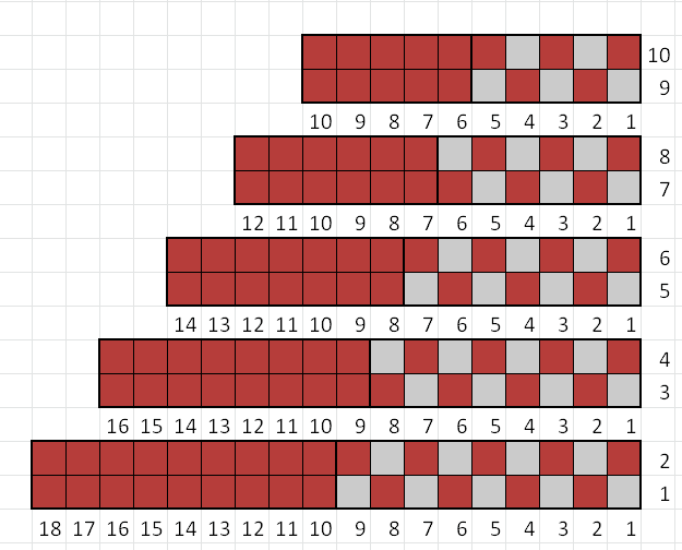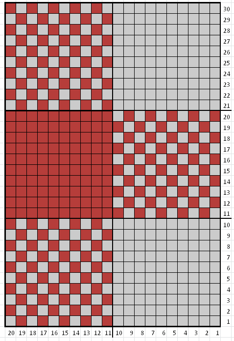 Slip stitches onto size 8 (5mm) circular needle to knit the remainder of the hat. Note that the remainder of the hat is knit in stockinette stitch (knit all stitches). Follow the colour chart below by repeating stitches 1-20 five times per round for the next 30 rounds. Colour A is represented by the grey squares, and colour B is represented by the red squares.