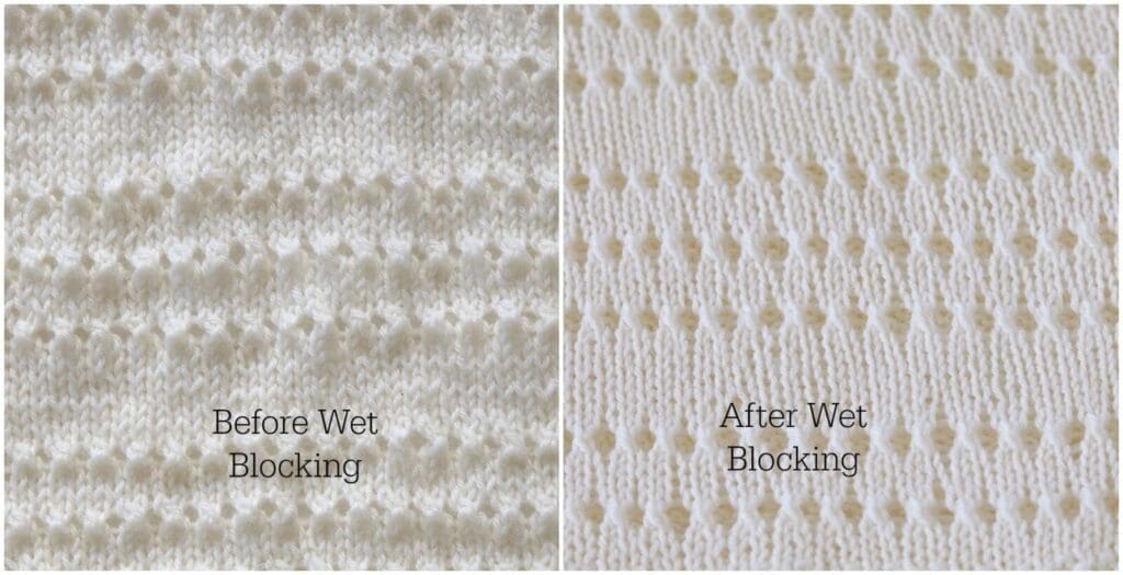 Wet block the blanket to flatten out the stitches and lengthen it to its final measurement of 30” wide X 41” long. After wet blocking, the stitches will also look more defined and evenly spaced. Below is a photo of how the blanket will look before and after wet blocking. If you are not familiar with wet blocking, refer to the following article on the Leelee Knits blog on how to wet block your knitting.