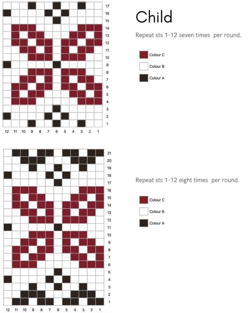 - Colour C: Garnet Heather (Approx. 16 yards for adult / 14 yards for child)