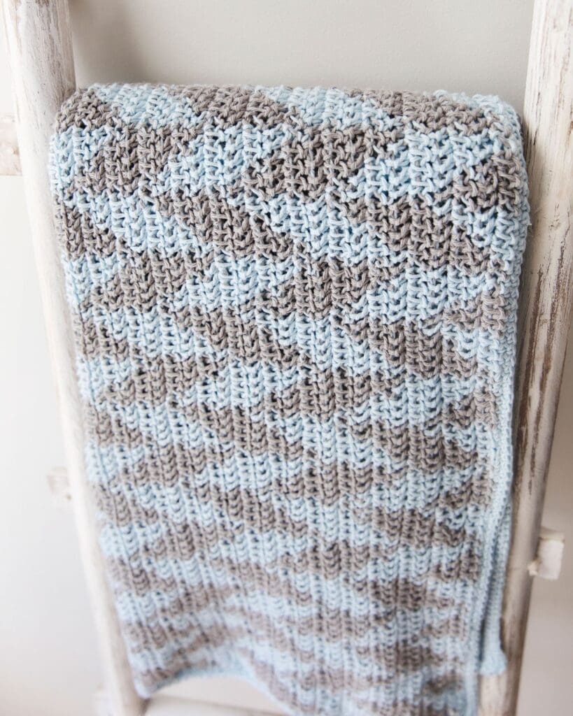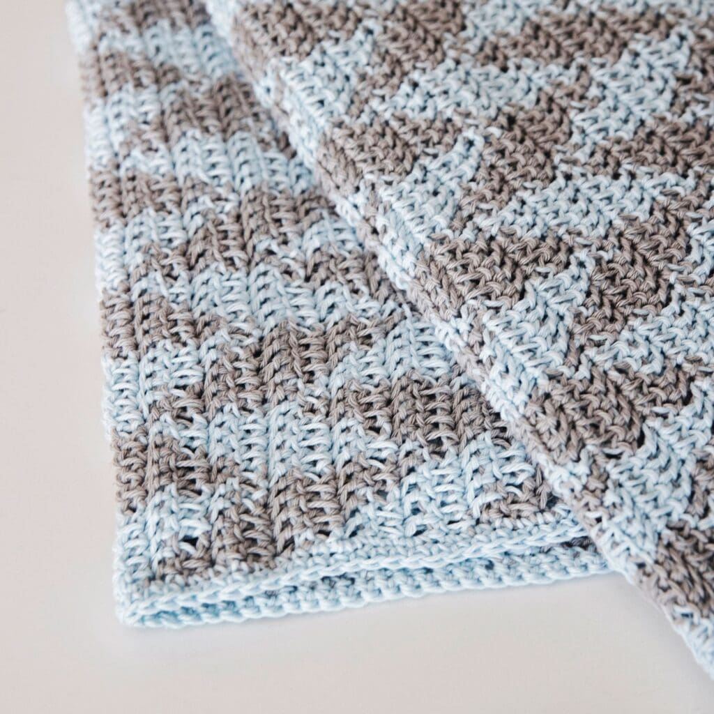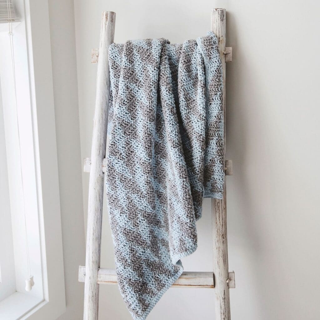 In this video, I will demonstrate how to work the Herringbone Half Double Crochet with two colors. This stitch is a simple variation of the half double crochet, which makes it super easy to learn. I’ll demonstrate using the color pattern for my Night-Night Baby Blanket, which is posted for free on this blog and supported by ads.