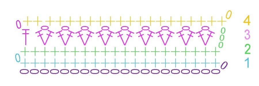 Row 3: *Skip next sc, V-stitch in next SC; repeat from * to last 2 sc, skip next sc, DC in last sc; CH1, turn.