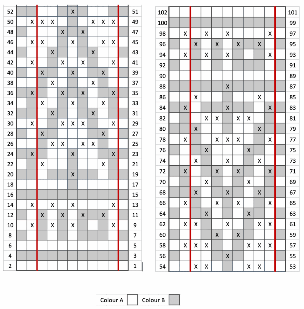 - The first and last squares of each row will indicated which colour to use.