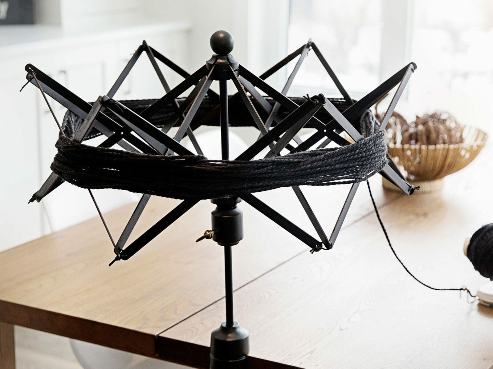 Simply clamp the swift onto a table or counter top to start winding yarn neatly and easily. Starting with the umbrella in the down position, place the open loop of the hank over the swift and pull it lightly so the far side of the hank is against the center of the umbrella. Then, use your free hand to slide up the umbrella clamp and open the umbrella to snuggly fit the circumference of the hank. Finally, secure the umbrella clamp in place and then wind away!