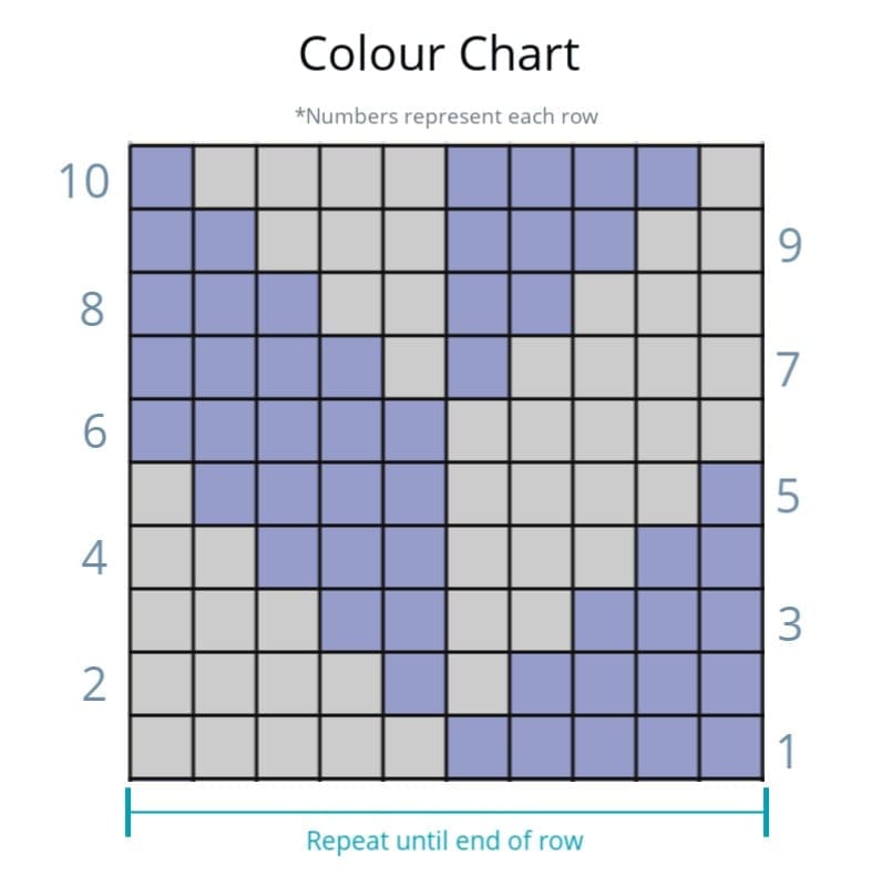 Repeat the 10 rows of the colour chart until your blanket measures just over 44 inches. Continue to Border and Finishing.