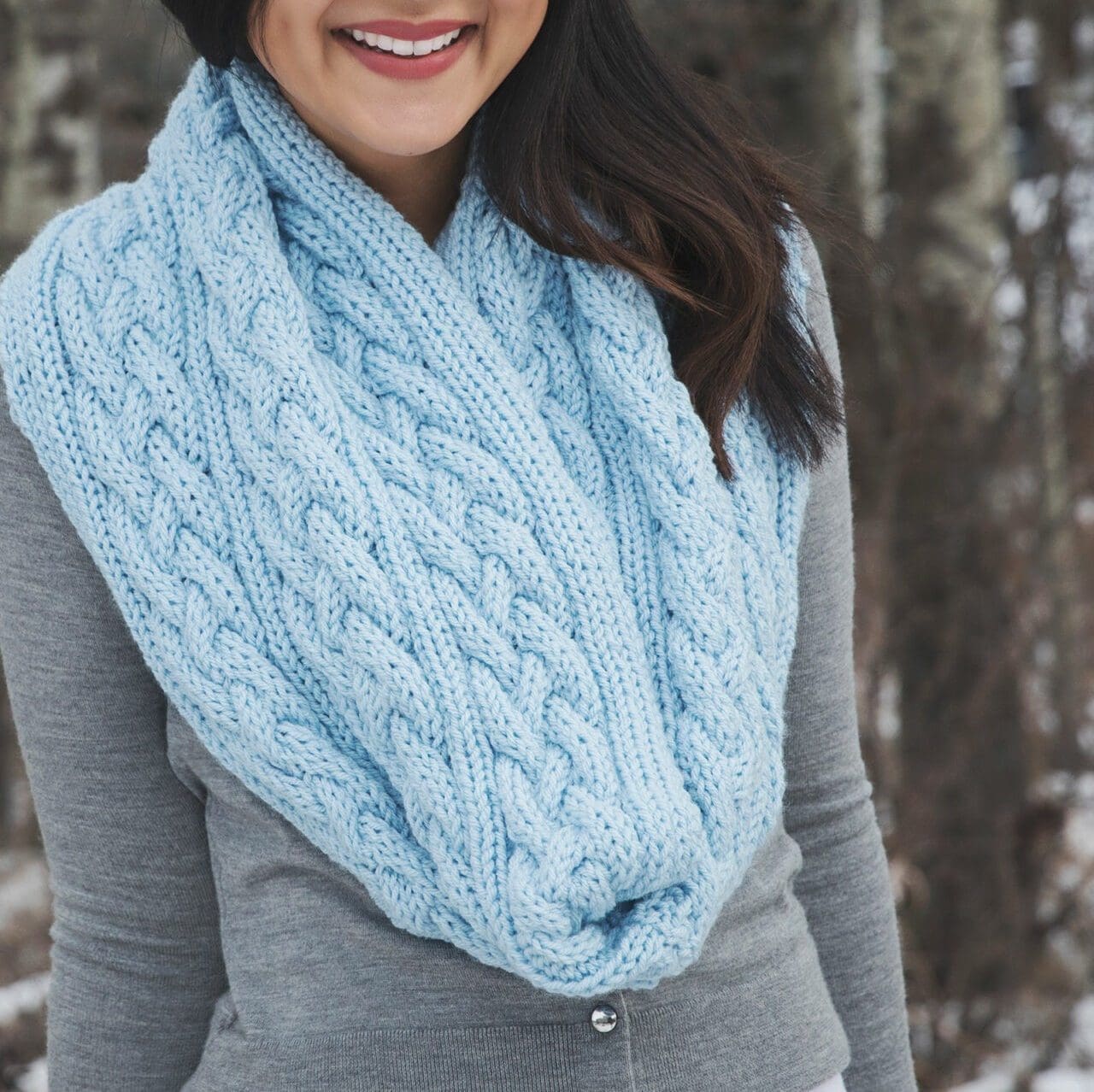 The free knitting pattern for this cozy scarf is available right here on this page, as this site is sustained through ad support.