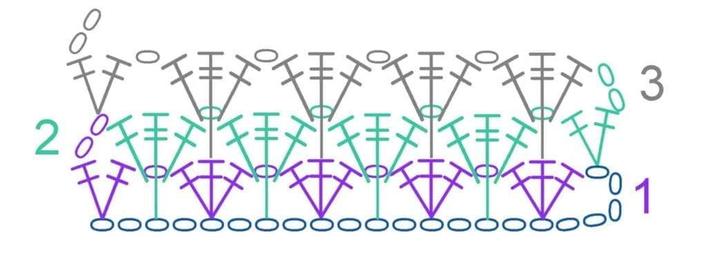 Row 1: Work 3 DC in sixth chain from hook; *CH1, skip next 3 ch, 3DC in next ch; repeat from * across, ending last rep with 2DC (instead of 3) in last ch. CH2, turn.