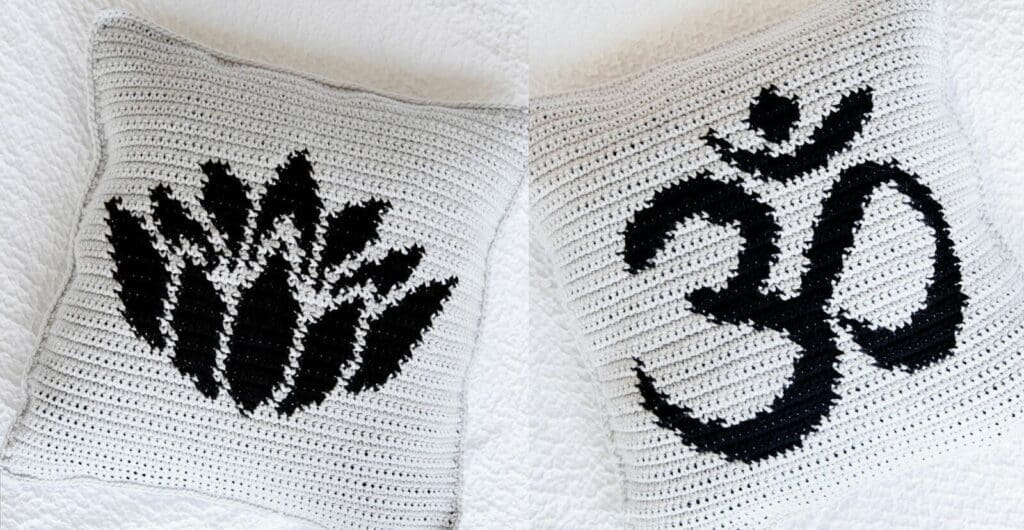For those of you that don’t know me personally, I have a tendency to be a little bit high strung and anxious. I over analyze to the point that it drives my extremely laid back husband crazy – and I’m currently worrying that you guys will hate this pattern and unsubscribe! When I discovered hot yoga, I finally felt like I had control over my thoughts. The breathing exercises combined with a good workout (and a lot of sweat) are often all I need to get back into a calm state of mind. I honestly cannot imagine my life without yoga and meditation, which is why I made these pillows – to remind me to breathe and be present instead of worrying about the future. And of course, to share the pattern with all of you!